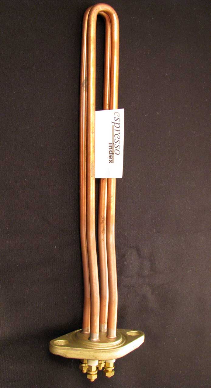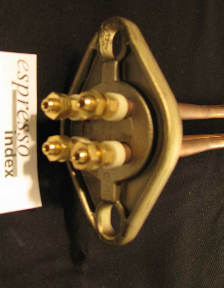 Heizkörper incl. Teflon Dichtung ( Bild 3 ) für 2 gruppige San Marino Espressomaschinen. 2 Kreisig / 4 polig, Flanschanschluss, Anschlussmöglichkeit 220/240 Volt, 2600 Watt, Länge Einbaumaß ca. 305 mm.